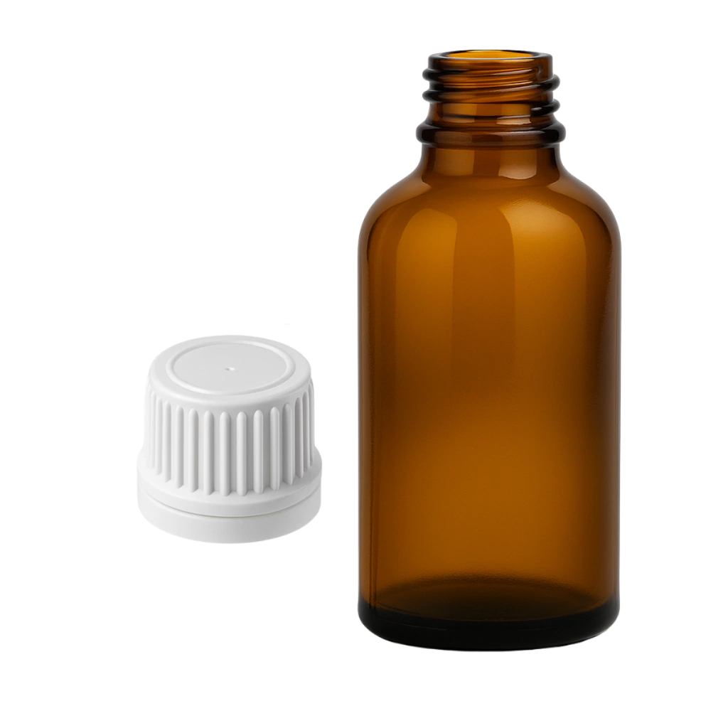 Modelo: Colirio x 30 ml B/R/18 mm DIN vidrio ámbar EURO con Tapa rosca Inviolable Precintada DIN Rosca 18 mm color Blanca.